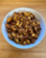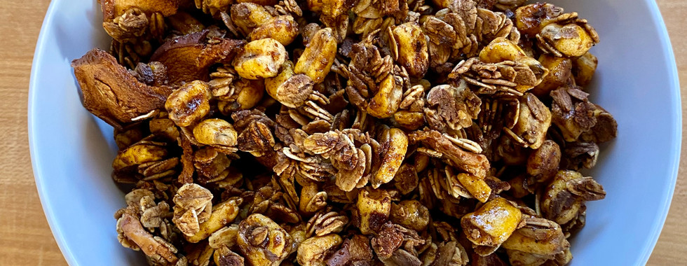 1 cup old fashioned oats 1 cup corn nuts ¾ cup apple chips 1/8 cup maple syrup 1/8 cup molasses 1 tsbp coconut oil 1 tsp cinnamon 1 tsp vanilla Pinch of salt