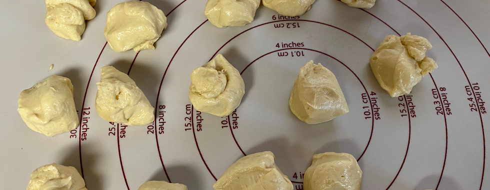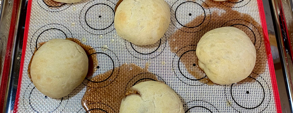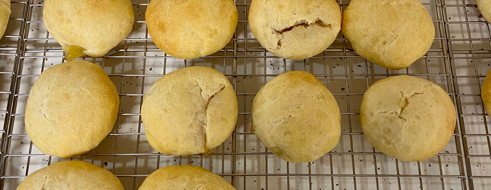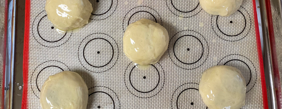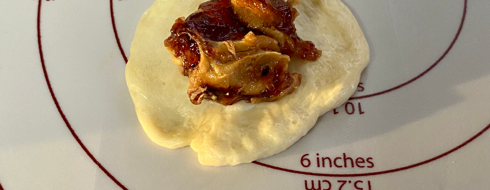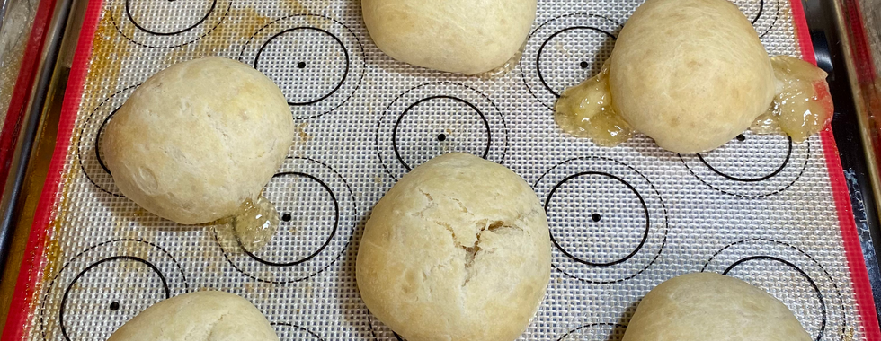 Divide dough into 60 equal balls (mine were about 21 grams each). Flatten dough ball, then put teaspoon of desired filling into the center of the flattened ball. Bring up the edges of the dough and pinch together to seal. Put sealed balls seam side down on baking pan. Brush with melted butter. Let rise until doubles in size. Bake at 350° for about 13-18 minutes or until golden brown.