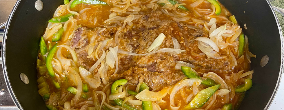 Pound flour, salt, and pepper into steak. In preheated skillet, cook onions in 3 tablespoons of shortening and set aside. Add remaining shortening and brown steak on both sides. Reduce heat and add celery, garlic, chili sauce, and water. Cover and simmer 1 hour. Add pepper and cooked onions to skillet and continue cooking for 30 minutes or until meat is very tender.