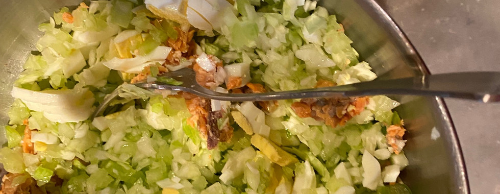 Use ¼ head of cabbage chopped fine, 4 stalks of celery cut in bits, 1 can salmon, salt, and 2 hardboiled eggs, chopped. Mix all together, and serve with a dressing as follows: 1 pt. vinegar, the beaten yolks of 4 eggs, 1 tablespoon mustard, ½ cup sugar, and 1 tablespoon. Corn starch. When cold or ready for use, add ½ cup cream. Mrs. Gurdon Corning, from The Saginaw Cookbook, published by First Congregational Church.