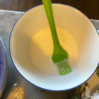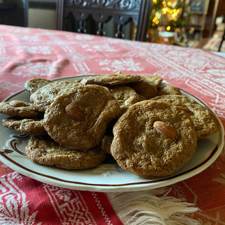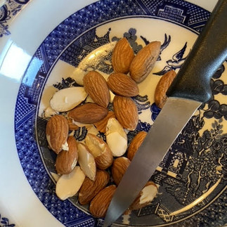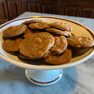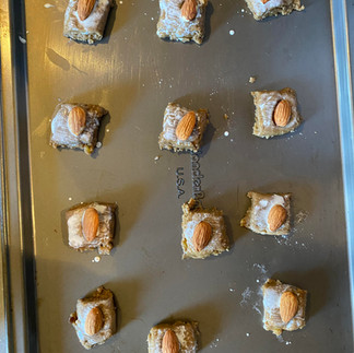 Flour pastry cloth or parchment and form dough into ¼ inch thick sheet and cut into 1-inch squares. Place on greased cookie sheets. Using pastry brush, cover surface with cream. Place a ½ of almond in the center of each cookie. Bake 10 – 14 minutes. (Please be aware that we used a convection oven. Cooking times in a regular oven may be longer.)