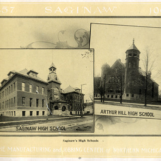 Competition was not limited to students and athletic events. Saginaw’s philanthropic activities reflected and reinforced the division. Heavenrich Bros. & Co. established a scholarship for students of Saginaw High School in 1891. Two years later lumberman Arthur Hill established scholarships for the former Saginaw City High School - it was renamed in his honor. In 1905, the Burt Manual Training School was dedicated. This addition to the Saginaw High campus, was made possible by a $235,000 gift from Wellington R. Burt. Six years later, with a bequest from Arthur Hill, construction started on Arthur Hill Trade School to serve the west side schools.