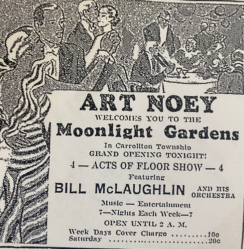 In 1935, Art Noey sold his share of the Green Mill to his business partner Sam Wallace – Wallace had also been the saxophonist in Noey’s band. Noey became the sole proprietor of his next club, Moonlight Gardens. Located in Carrolton, where Hickory Street crosses the railroad tracks, the club’s grand opening was held on May 4, 1935.
