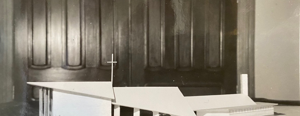Architect Glenn “Red” Beach left a rich legacy of elegant mid-century modern buildings throughout our community. Born in Medina, New York, in 1916, Beach graduated with a degree in architecture from Syracuse University. After graduating, he moved to Saginaw in September 1940 to accept a position as an architectural sales representative for Pittsburgh Plate Glass. He soon met Midland architect Alden B. Dow – whose work and design philosophy he greatly admired. Beach left Saginaw during World War II to attend Naval Training Schools at Cornell and Oahu. He served as an officer in the U.S. Navy where he taught radar in Hawaii. After the war, he returned to Saginaw. After a brief stint working for the firm of Frantz and Spence, he joined Alden B. Dow’s office. In 1948, he left to open his own practice. His work included designs for residences, churches, schools, and office buildings – he even designed the Bavarian Inn in Frankenmuth. Although his admiration for Dow’s work is apparent, his style is uniquely his own. Each building was designed to reflect the needs and desires of his clients and the demands of the site.