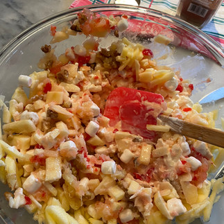 6 med. to lg. Cortland apples (be sure they're Cortlands because they won't turn brown as easily and freeze well) Can of crushed pineapple 1/4 c. sugar Sprinkle cinnamon 1 to 1 1/2 c. small marshmallows ½ c. walnuts ½ c. maraschino cherries, cut up 1 c. sour cream