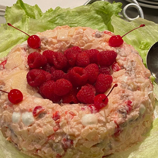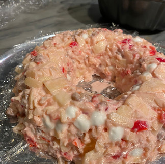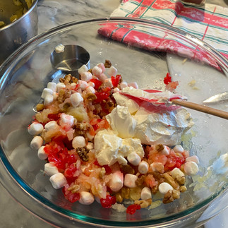 The pale pink color of the finished salad was a surprise and is a result of the maraschino cherries. It is possible that some brands of cherries may contain less dye and would impart less color