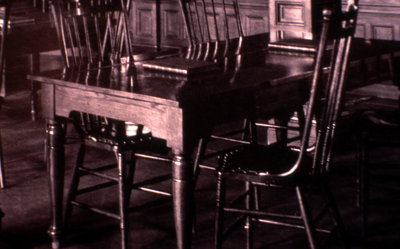 Image (2) Image of delivery room--Originally Hoyt Public Library was a non-circulating reference library. Books were stored in a fireproof bookroom. To locate a book, patrons started by consulting a bound subject list, copies of this book catalog are visible on tables in this image. Users filled out a request slip and submitted it at the delivery counter. The librarian would retrieve the books from the bookroom. It was said that books would silently and magically appear. The system was complex and complicated.