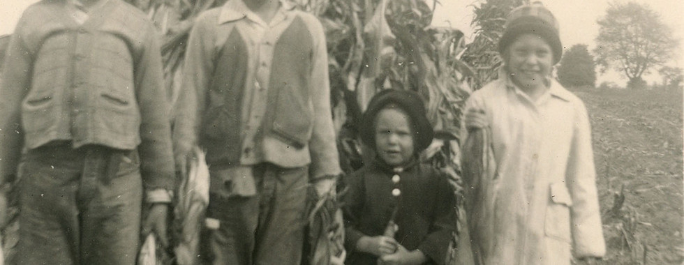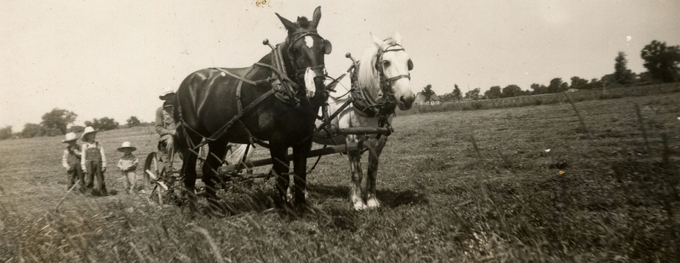 1943 image of Henry plowing the field with his horses Dan & Dick, Arthur, Kenneth and Elaine are following behind the plow. (image 5)