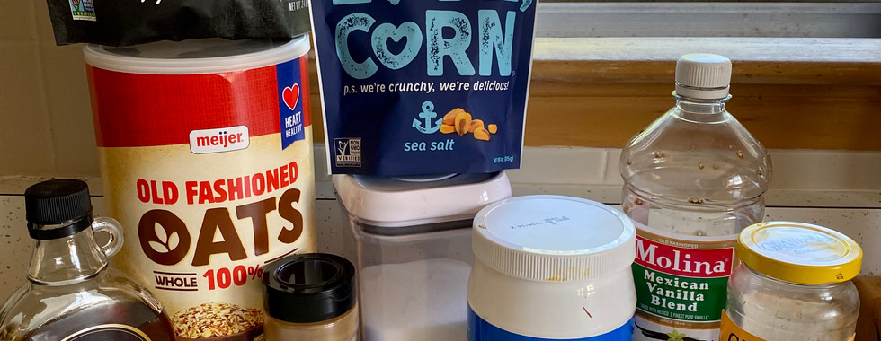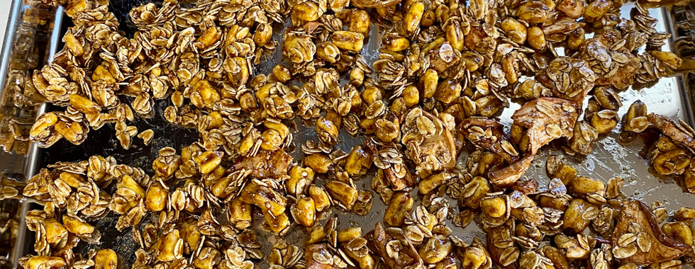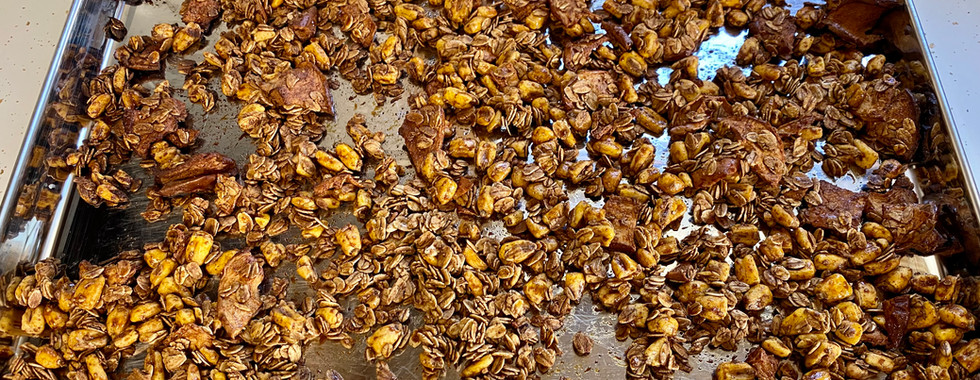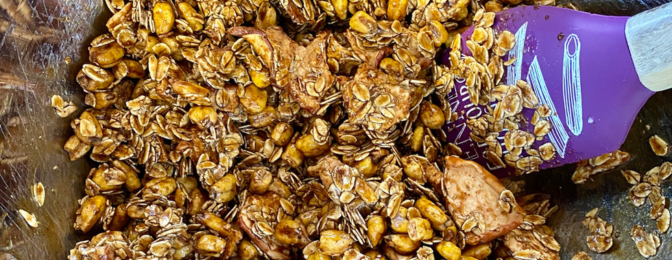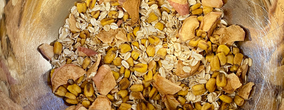 1 cup old fashioned oats 1 cup corn nuts ¾ cup apple chips 1/8 cup maple syrup 1/8 cup molasses 1 tsbp coconut oil 1 tsp cinnamon 1 tsp vanilla Pinch of salt