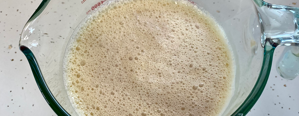 In a separate bowl, mix the warm water, teaspoon of sugar, and yeast. Mix until yeast is dissolved. Put off to the side until it doubles itself. After yeast has doubled, lightly mix in milk mixture until combined.