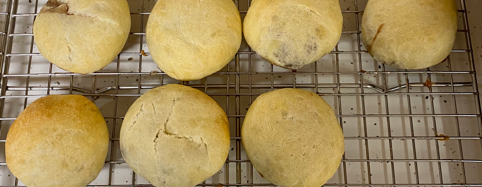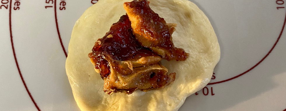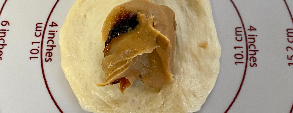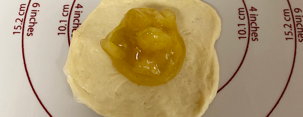 Divide dough into 60 equal balls (mine were about 21 grams each). Flatten dough ball, then put teaspoon of desired filling into the center of the flattened ball. Bring up the edges of the dough and pinch together to seal. Put sealed balls seam side down on baking pan. Brush with melted butter. Let rise until doubles in size. Bake at 350° for about 13-18 minutes or until golden brown.