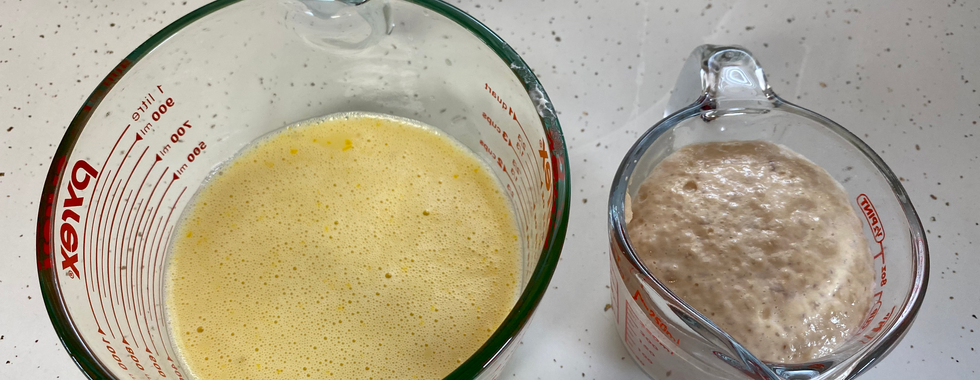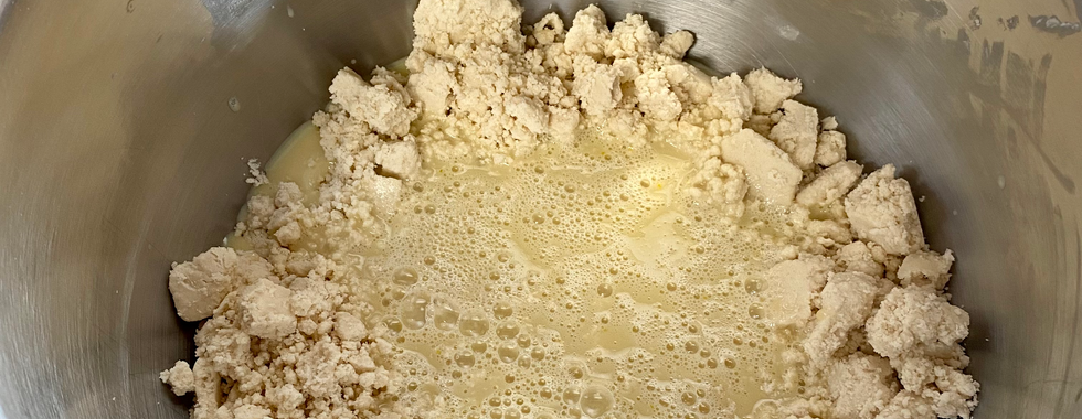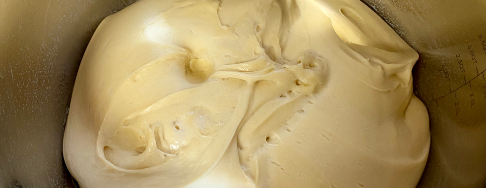Change mixer paddle to bread hook. Make a well in the flour in the mixer bowl. Pour all of the liquid mixture into the flour well. Mix with bread hook until a smooth, well combined dough forms. Let mixer knead dough for about 5 minutes. Put dough in greased bowl, cover, and place dough in refrigerator for at least 4 hours.