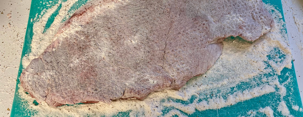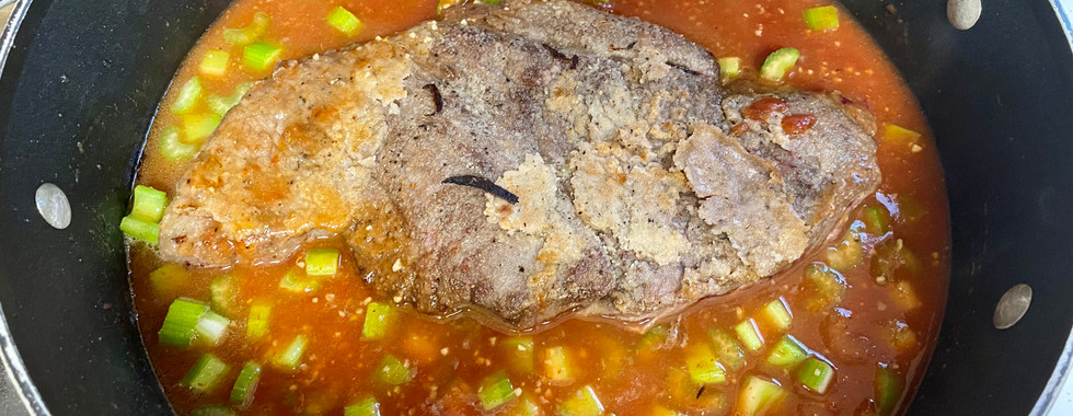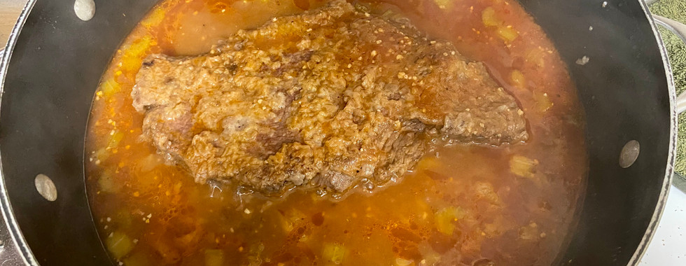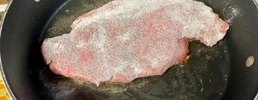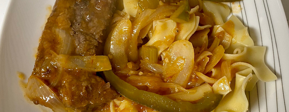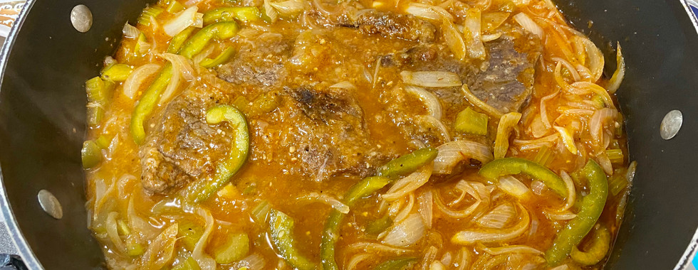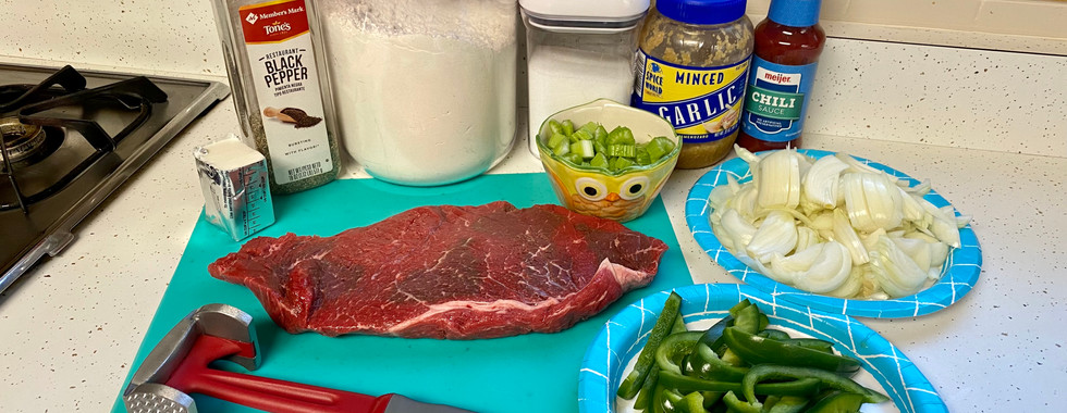 Pound flour, salt, and pepper into steak. In preheated skillet, cook onions in 3 tablespoons of shortening and set aside. Add remaining shortening and brown steak on both sides. Reduce heat and add celery, garlic, chili sauce, and water. Cover and simmer 1 hour. Add pepper and cooked onions to skillet and continue cooking for 30 minutes or until meat is very tender.