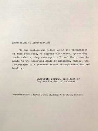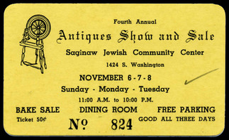The Castle Museum’s collection includes one sheet of drawings of the façade of Temple B’nai Israel’s 1913 building. A ticket to the 1960 Antique show – it was held in the Jewish Community Center before the addition of the 1964 Temple. A drawing of the 1964 Temple and a photograph of detail of the windows; the cover and pages from “The Kitchens of Our Mothers.”
