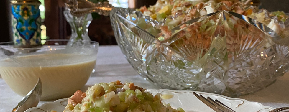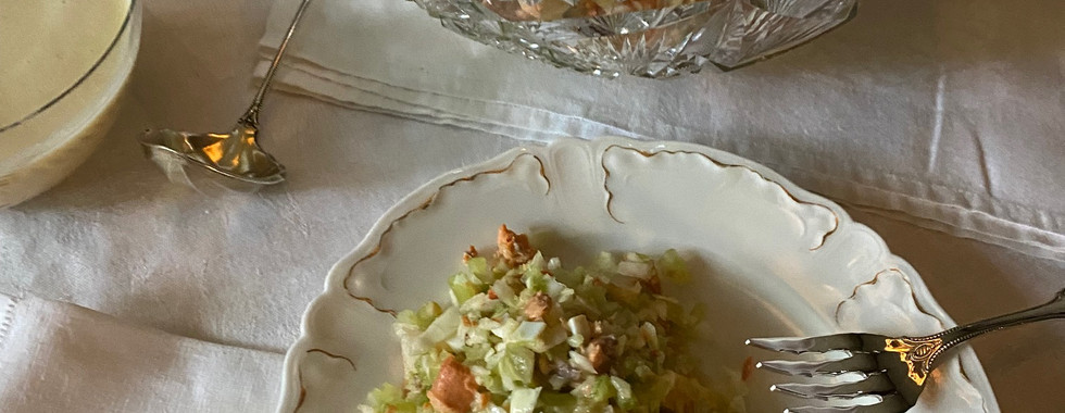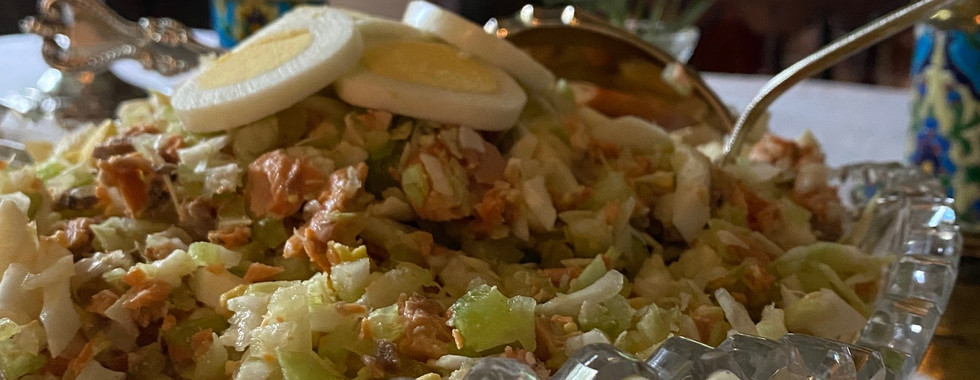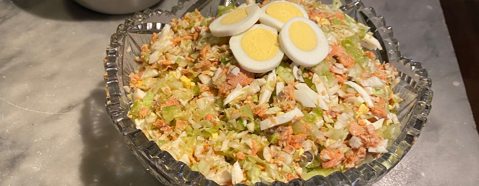 Use ¼ head of cabbage chopped fine, 4 stalks of celery cut in bits, 1 can salmon, salt, and 2 hardboiled eggs, chopped. Mix all together, and serve with a dressing as follows: 1 pt. vinegar, the beaten yolks of 4 eggs, 1 tablespoon mustard, ½ cup sugar, and 1 tablespoon. Corn starch. When cold or ready for use, add ½ cup cream. Mrs. Gurdon Corning, from The Saginaw Cookbook, published by First Congregational Church.