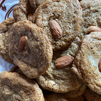 Flour pastry cloth or parchment and form dough into ¼ inch thick sheet and cut into 1-inch squares. Place on greased cookie sheets. Using pastry brush, cover surface with cream. Place a ½ of almond in the center of each cookie. Bake 10 – 14 minutes. (Please be aware that we used a convection oven. Cooking times in a regular oven may be longer.)