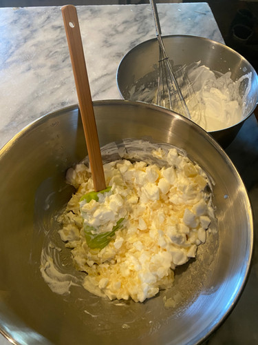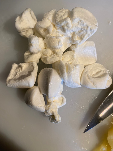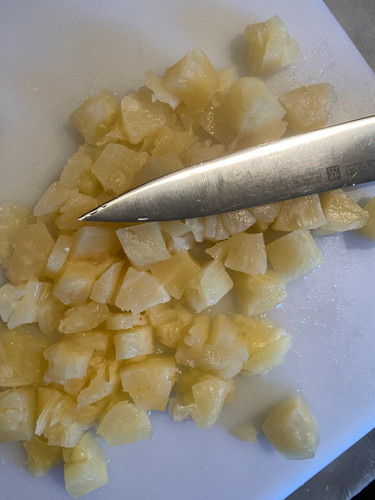 When dicing the pineapple and marshmallows, follow the original instructions literally and chop them together - at the same time. The slight amount of moisture from the pineapple makes it much easier to slice the marshmallows. The recipe makes about four servings.