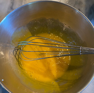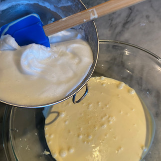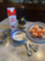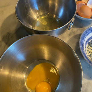 Separate eggs. Beat whites until stiff and frothy. Beat eggs yolks and then add powdered sugar and beat until combined. Slowly add cream to the beaten egg yolk and sugar mixture. Then slowly add brandy to mixture. Finally, add beaten egg whites. [The test kitchen staff combined the two parts by aggressively folding the white into the yolks – perhaps lightly whisking would be more accurate.)