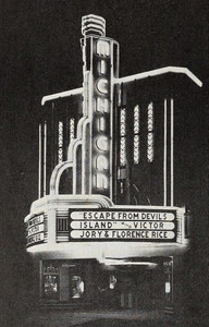 The marquee with bowed sides had enamel finished porcelain to match the colorful steel. Highlighting all of this was 2,000 feet of neon light tubing and recessed lighting. Even this black and white photo shows how dramatic this must have been after dark.