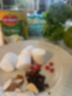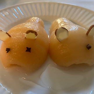 Now comes the fun part: Assuming the narrow part of the pear is the head of the rabbit, use two almonds to create ears, one red hot candy to create a nose* and two cloves for eyes. Position the marshmallow at the rear of the “mock bunny” to act a fluffy tail. And that is it. And this seems much easier than it was in 1972 – there were many more distractions in a junior high school Home Economics class.