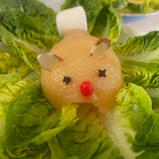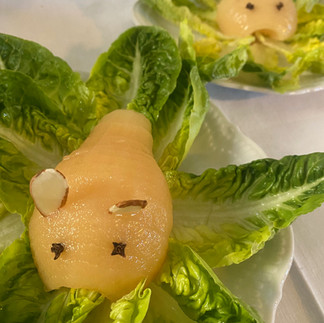 Create a bed of lettuce on each plate – making certain that the center of each plate contains a flat area appropriate for a nesting mock-rabbit. Place a half pear on each plate cut side down.